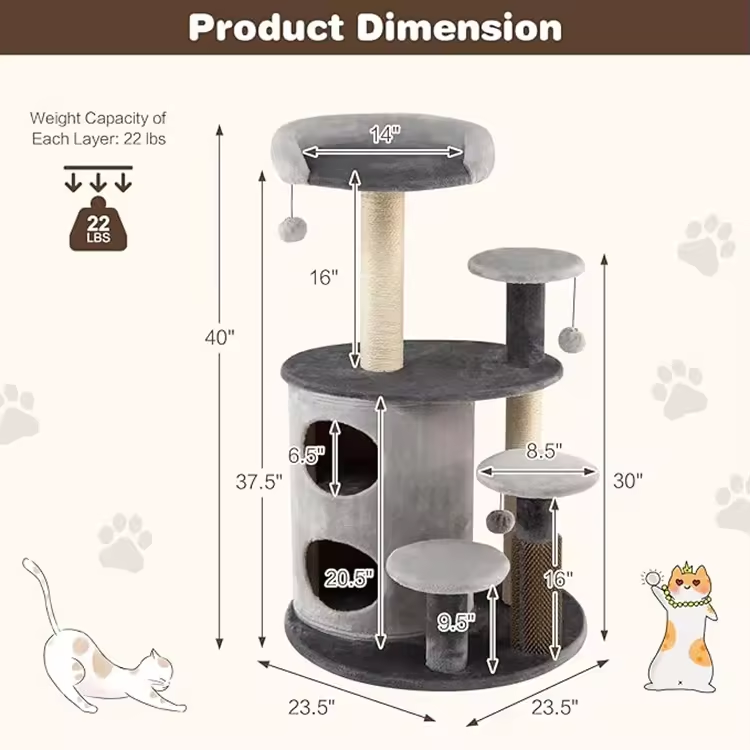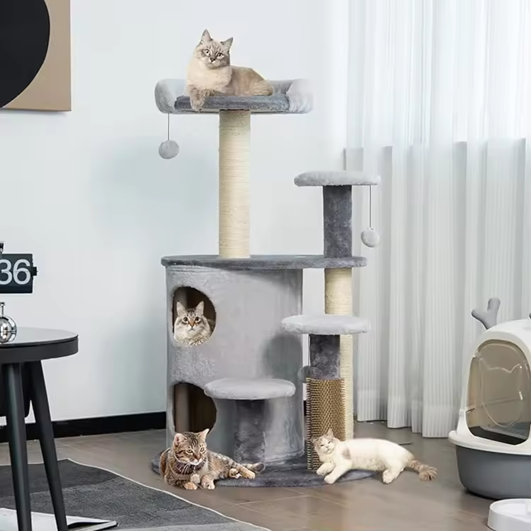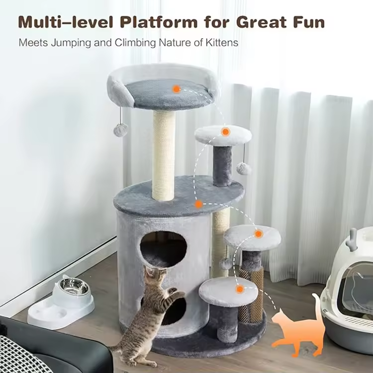 High Quality Grey Plush Multi-level Cat Scratching Tree Tower With Small Balls